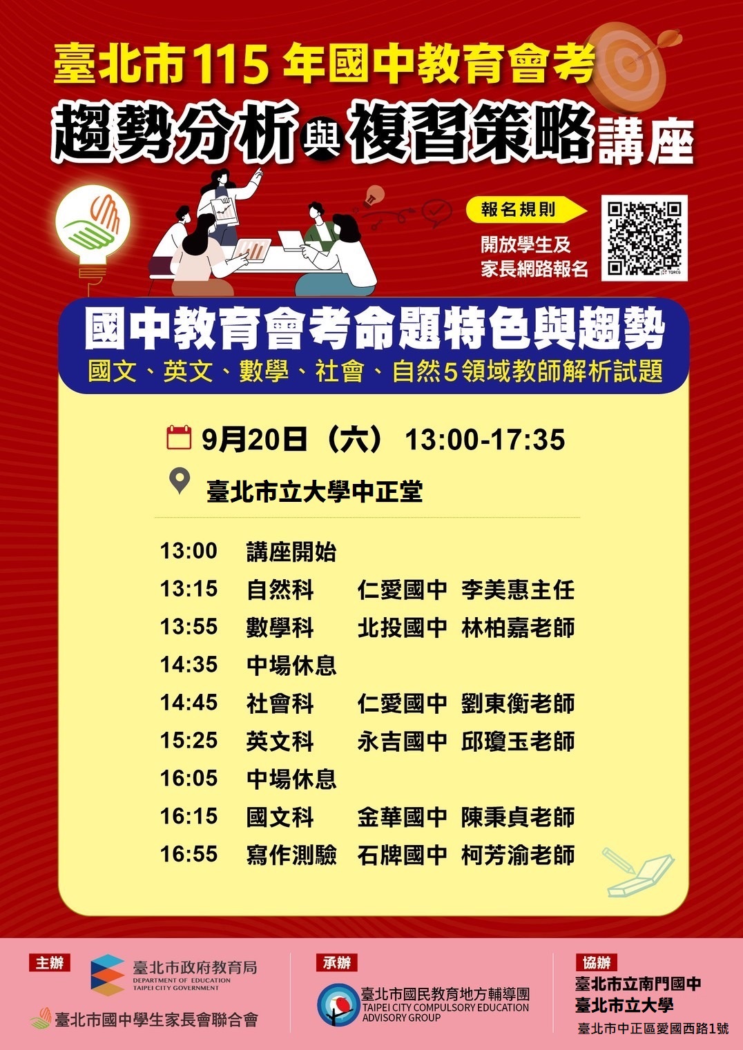 校園公告 公告主旨 「115年國中教育會考趨勢分析與複習策略講座」變更活動場地一案 發佈日期 2025 年 9 月 03 日 發佈單位 教學組 公告類別 校務公告, 升學資訊 公告等級 轉知 點閱次數 83 公告內容 請詳閱附件內容。 相關附件 「115年國中教育會考趨勢分析與複習策略講座」變更活動場地一案 「115年國中教育會考趨勢分析與複習策略講座」變更活動場地一案 檔案名稱檔案大小檔案格式下載「115年國中教育會考趨勢分析與複習策略講座」變更活動場地一案.pdf284.42 KB新視窗開啟檔案「115年國中教育會考趨勢分析與複習策略講座」海報.jpg467.84 KB新視窗開啟檔案 「115年國中教育會考趨勢分析與複習策略講座」變更活動場地一案.pdf「115年國中教育會考趨勢分析與複習策略講座」海報.jpg 115年國中教育會考趨勢分析與複習策略講座流程表 115年國中教育會考趨勢分析與複習策略講座流程表 檔案名稱檔案大小檔案格式下載115年國中教育會考趨勢分析與複習策略講座流程表.pdf59.60 KB新視窗開啟檔案 115年國中教育會考趨勢分析與複習策略講座流程表.pdf 【2025-09-03】「114年中小學校長公 開授課與專業回饋工作坊」及「114年新世代 ... 【2025-09-03】轉知「臺北市114學年度STEAM課程地圖與種子教師培訓 實施計畫」