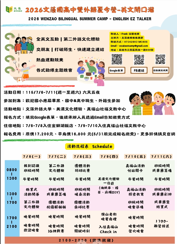 校園公告 公告主旨 2026文藻國高中雙外語夏令營 發佈日期 2026 年 4 月 22 日 發佈單位 教學組 公告類別 活動訊息 公告等級 轉知 點閱次數 28 公告內容 請參閱附件內容。 相關附件 2026文藻國高中雙外語夏令營海報合併版 2026文藻國高中雙外語夏令營海報合併版 檔案名稱檔案大小檔案格式下載2026文藻國高中雙外語夏令營海報合併版.pdf220.08 KB新視窗開啟檔案2026文藻國高中雙外語夏令營海報.jpg471.29 KB新視窗開啟檔案 2026文藻國高中雙外語夏令營海報合併版.pdf2026文藻國高中雙外語夏令營海報.jpg 【2026-04-22】國立台北教育大學辦理「2026兒童夏令營」活動 【2026-04-22】檢送國立陽明交通大學辦理「A3數位素養講師回流研習」 活動實施 ...